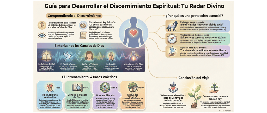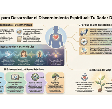 Hemos descubierto que el discernimiento es mucho más que una habilidad; es un regalo divino, accesible para todos, que nos protege del engaño, nos guía hacia decisiones sabias y nos llena de una paz que sobrepasa todo entendimiento. Se desarrolla a través de prácticas intencionales como la oración sincera, el estudio profundo de la Palabra de Dios y la disciplina de escuchar en silencio.
